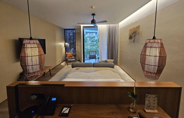 เริ่มต้นการเข้าพักด้วยการ Check-in เลือก Welcome Drink จากตู้เย็นเป็นน้ำสมุนไพรท้องถิ่น ก่อนจะพาเรานั่งรถตุ๊กๆไฟฟ้า EV ให้คำแนะนำสถานที่โดยรอบของโรงแรม และส่งยังห้องพัก แนะนำข้อมูลต่างๆ ขอโรงแรมโดยละเอียด โรงแรมนี้เปิดใหม่ได้ไม่นานมีพื้นที่ขนาดใหญ่มากๆ