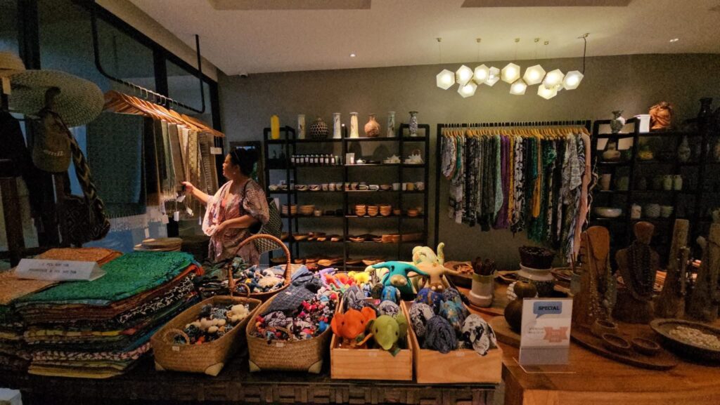 ภายในโรงแรมมีร้านของฝากและงานแฮนด์คราฟต์ที่เป็นฝีมือจากท้องถิ่นมาจัดแสดงให้เราได้เลือกชมเลือกช้อปกันด้วย นอกจากจะได้ของดีและมีคุณภาพแล้ว ยังได้สนับสนุนฝีมือของศิลปินท้องถิ่น